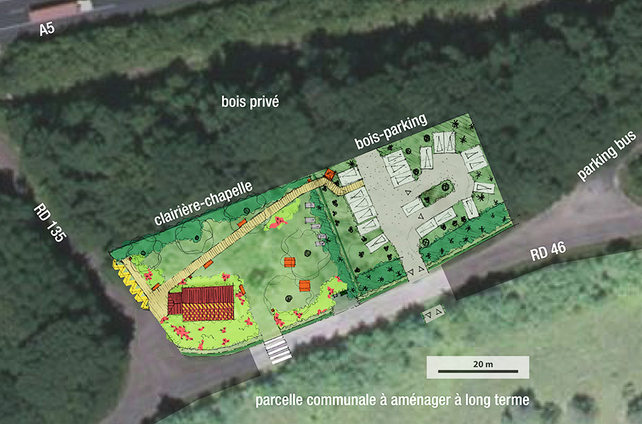 3/ Intégrer les flux dans le paysage (et non planter les voies). Insérer le parking au cœur du bois pour masquer les véhicules en identifiant les contraintes techniques (accès éloigné du carrefour, stabilité des sols…). Créer l’arrêt au plus près mais le stationnement distancié du bus. Anticiper l’aménagement futur de la parcelle au sud de la départementale.