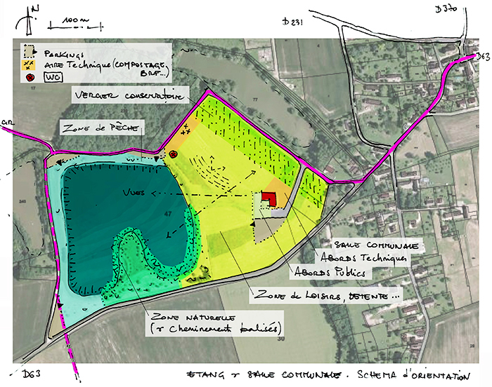 Après visite approfondie et analyse du site, le CAUE de l’Yonne a questionné les opportunités de réaliser des aménagements extérieurs. En est ressortie la nécessité de créer un parc au caractère unitaire. Cette unité intégrera bien-sûr les fonctions existantes (étang de pêche / salle des fêtes) et à venir (parcours sportifs, ludiques, pédagogiques…).